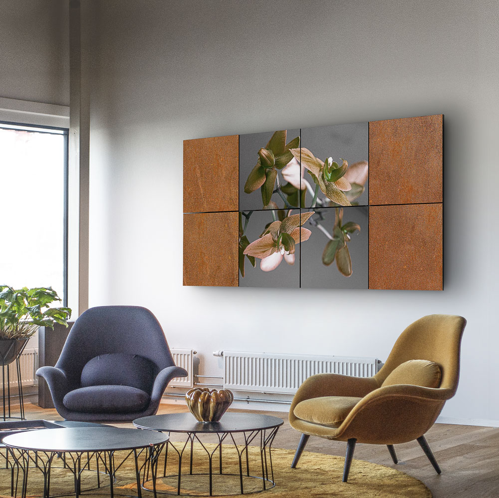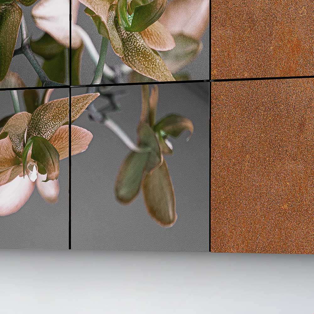 Väggskulptur bestående av fotografier printat på aluminium kombinerat med rostig plåt. Montage på mdf-board och monterad på distans 4 cm från väggen.